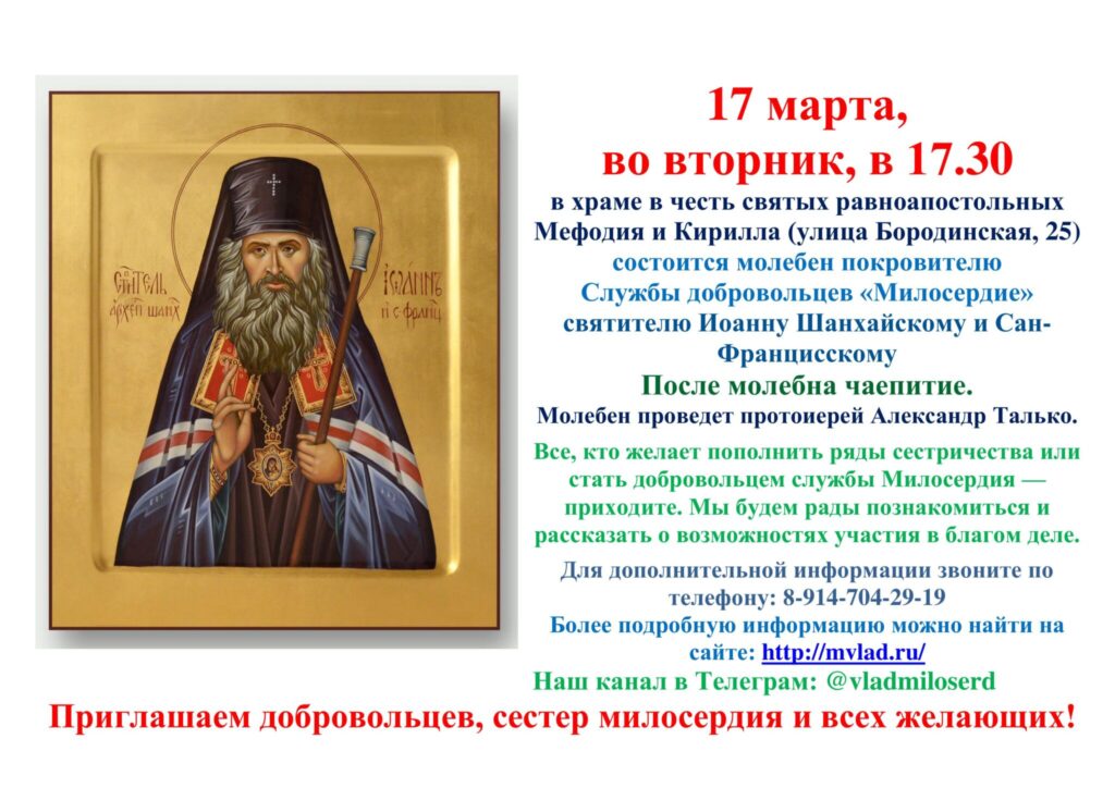 17 марта, во вторник, в 17:30 в храме равноапостольных Кирилла и Мефодия (ул. Бородинская, 25) состоится молебен покровителю Службы добровольцев «Милосердие» святителю Иоанну Шанхайскому и Сан-Францисскому.